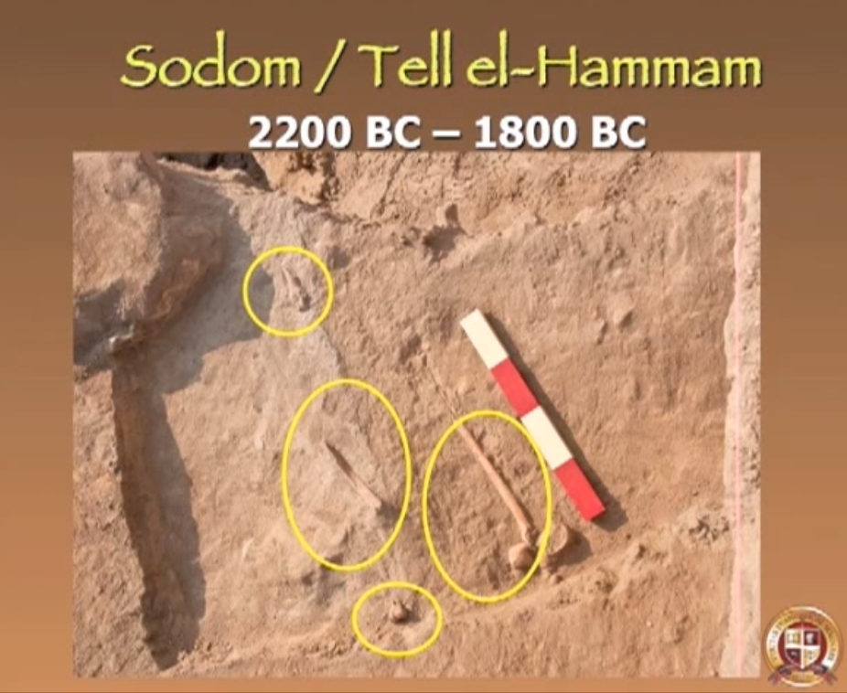 Skeletons are now being excavated at Sodom. The bodies found appear to have had their legs blown off. The bodies appear to have been blown to the western side of the city by a blast of some sort.